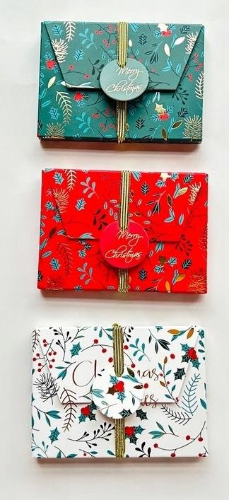 Pudełka na karty podarunkowe gotówkę 3 sztuki pudełeczka sztywne, wykonane z kartonu elegancki wzór świąteczny zdobienie wykończone hot-stampingiem folią metaliczną w kolorze złotym świetny sposób na ofiarowanie gotówki, karty podarunkowej lub wszelkiego rodzaju voucherów 3 sztuki... przeczytaj całość