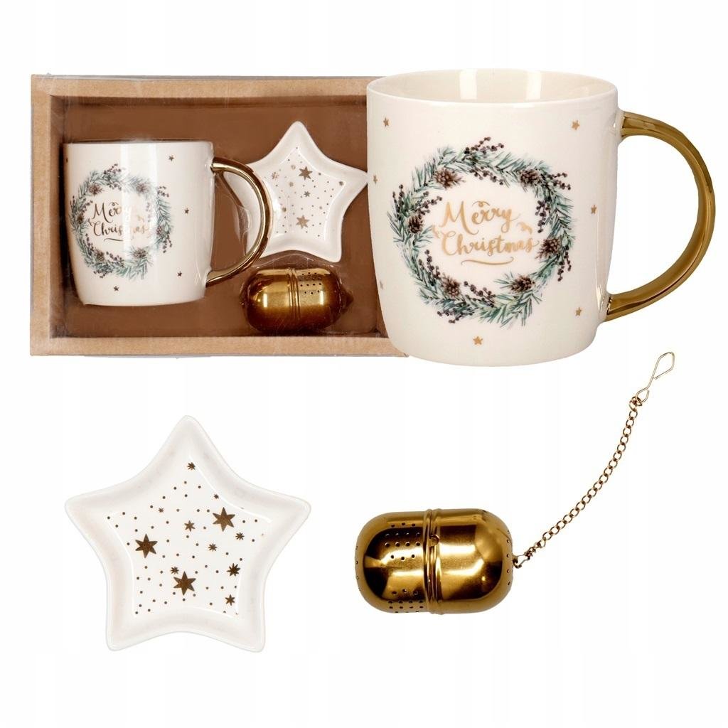 Zestaw kubek z zaparzaczem Merry ChristmasZestaw prezentowy w którego skład wchodzi:Kubek z wysokiej jakości porcelany new bone o pojemności 380ml.Zaparzacz metalowy do herbatySpodek do odłożenia zaparzaczaKubek z piękną świąteczną grafiką z elemetami złocenia. Zaparzacz metalowy w kolorze złotym...