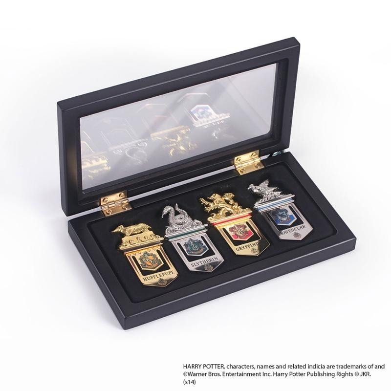 Set 4 záložek s erby a maskoty bradavických kolejí ve sběratelské krabičce. Rozměry: 16 x 9 cm przeczytaj całość