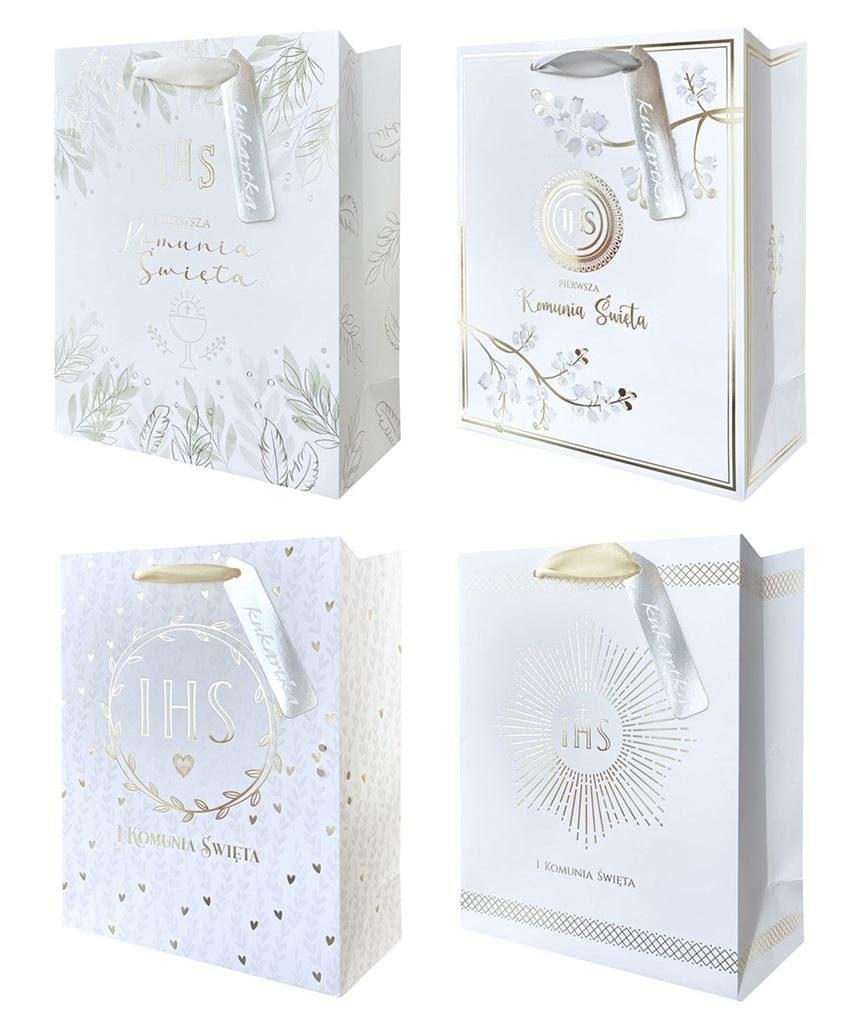 Oprócz świetnej jakości serii Q, wyróżniają się różnymi zdobieniami, ozdobną zawieszką oraz rączką z satynowej tasiemki. Są piękne, solidnie wykonane, w takiej torbie każdy prezent będzie prezentować się elegancko. Cechy szczególne: typ produktu: torba na prezent, zdobienie: metaliczna folia wielkość orientacyjna: 42 x 30 x 12cm (wysokość x szerokość x głębokość), okazja: Komunia
