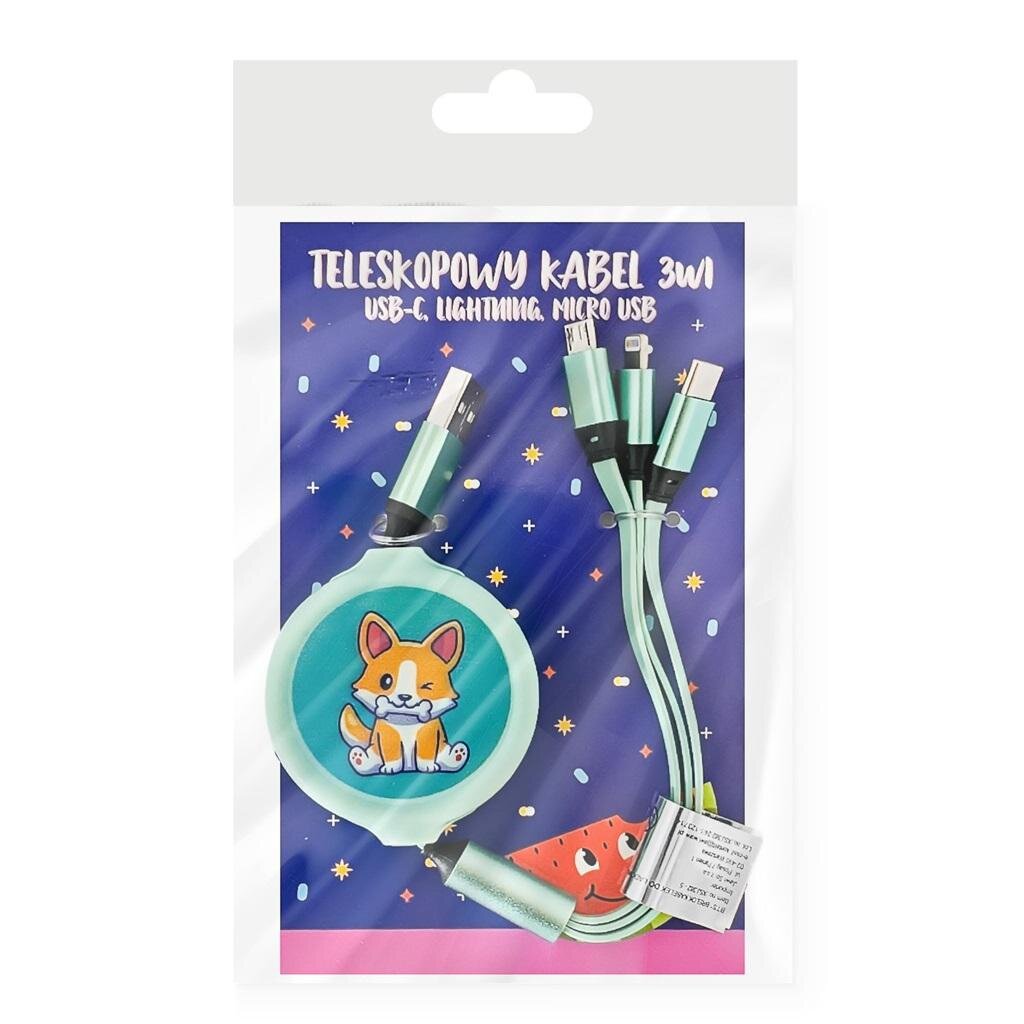 Produkt posiada 3 różne końcówki do ładowania oraz ponad metrowy, rozsuwany kabel co sprawia, że jest niezwykle użyteczny i uniwersalny. Kabelki do ładowania posiadają ciekawe kolory oraz grafikę. Długość kabelków po rozciągnięciu: 110 cm. Ładowanie: Micro/Lightning/Type C przeczytaj całość