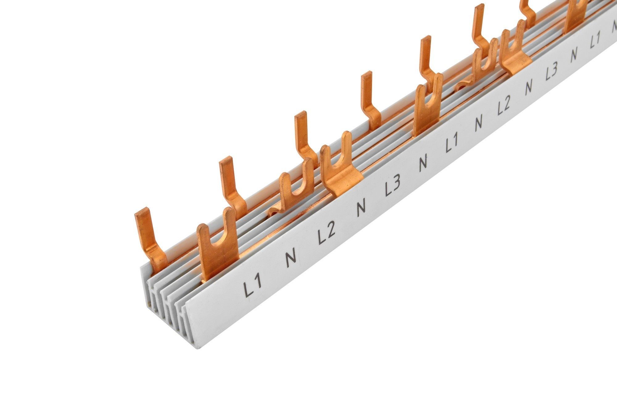 Prop. lišta G/S-L1+N-L2+N-L3+N-1000/16P, vidlička+kolík, 4-pól., 80A, rozteč 17,8+9mm, (37P+37N) přípojných míst, pro 1,5TE přístroje (např. 1+N pól. jističe).Propojení fází vidličkou, propojení N kontaktu kolíkem (jazýčkem).Použití: např. pro propojení 1+N pól. 1,5 modulových (1,5TE) jističů -...