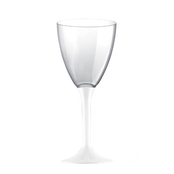 Elegancki plastikowy kieliszek do wina w zestawie 4 szt., o pojemności 18 cl. Materiał wygląda bardzo luksusowo i przypomina szkło. Biała stopka jest odłączana. Nadają się do ponownego użycia i można je myć. Świetny dodatek na Twoje ważne przyjęcie urodzinowe, event firmowy, rocznicę lub weselne przyjęcie. Pojemność: 18 cl. Ilość: 4 szt. Dwuczęściowy kieliszek z odłączaną stopką.