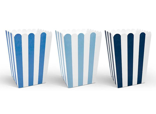 Pudełka wykonane są z wysokiej jakości papieru, a dzięki wymiarom 7x7x12,5 cm pomieszczą wygodnie około 0,7 litra popcornu lub innych drobnych przekąsek i słodyczy. Design w stylu marynistycznym z nowoczesnym niebiesko-białym wzorem jest świeży i stylowy, świetnie pasuje szczególnie na imprezy o tematyce marynistycznej.