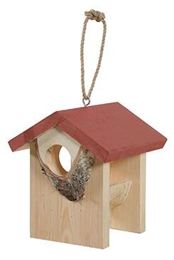 Budka se střechou z masivního dřeva o tloušťce 17 mm pro volně žijící ptactvo. Přírodní vzhled dřeva, který splyne se zahradou, dodáváno se silným provazem k zavěšení.  Červená střecha Velikost: L Dřevo zodpovědně získáno. Vyrobeno v Evropě.  Rozměry: 205 x 210 x 215 mm przeczytaj całość