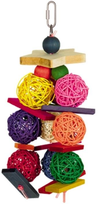 Aktivní hračka pro střední papoušky. Připevňuje se snadno ke kleci, pomocí karabinky se šroubovacím zavíráním. Hračka obsahuje: dřevěnné části, pletené míčky a zvoneček. Celková velikost 25cm. Velikost proutěných míčků je ø 5 cm. Upozornění: Pravidelně produkt kontrolujte, zda není poškozen a nahraďte jej, pokud objevíte závažnější poškození - jinak nelze vyloučit zranění zvířete.