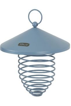 Závěsné kovové krmítko ve tvaru spirály, se stříškou, na lojové koule. Výška spirály 11cm.