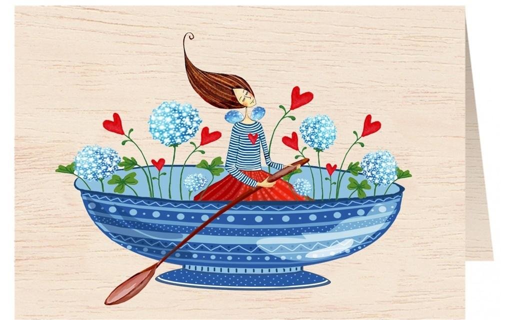 Karnet drewniany C6 + koperta Kobieta z dmuchawcem