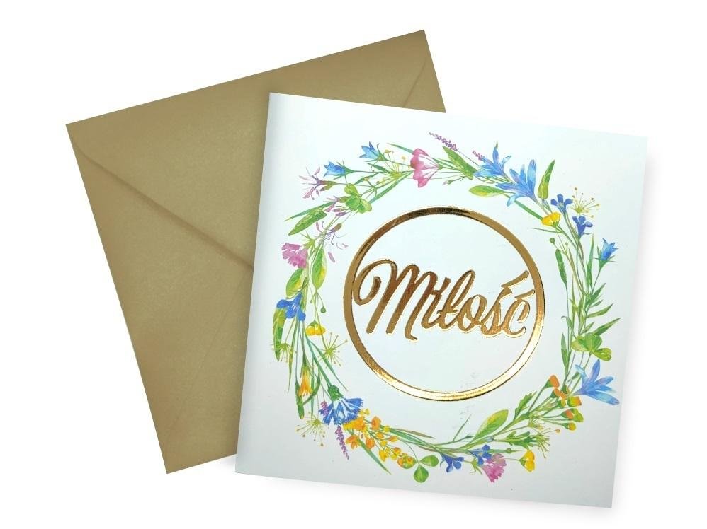 Karnet w formacie 15 x 15 cm. Wydrukowany na wysokiej jakości papierze. Uszlachetniony złotym metalicznym lakierem 3D. W zestawie perłowa koperta. przeczytaj całość