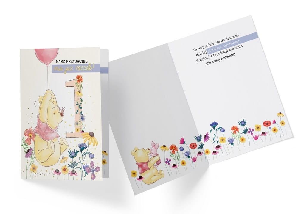 Kartka z serii Disney, na pierwsze urodziny, z ilustracją Kubusia Puchatka. Każda kartka z życzeniami z serii Disney jest kolorowa z każdej strony i zdobiona na froncie, w tym wypadku elementami ze złotej folii. W środku są krótkie życzenia i miejsce na własną dedykację. Specyfikacja: Wielkość kartki: B6, 12.5 x 17.6 cm Zdobienie: Tak Tekst życzeń w środku: Tak Okazja: Urodziny, roczek.