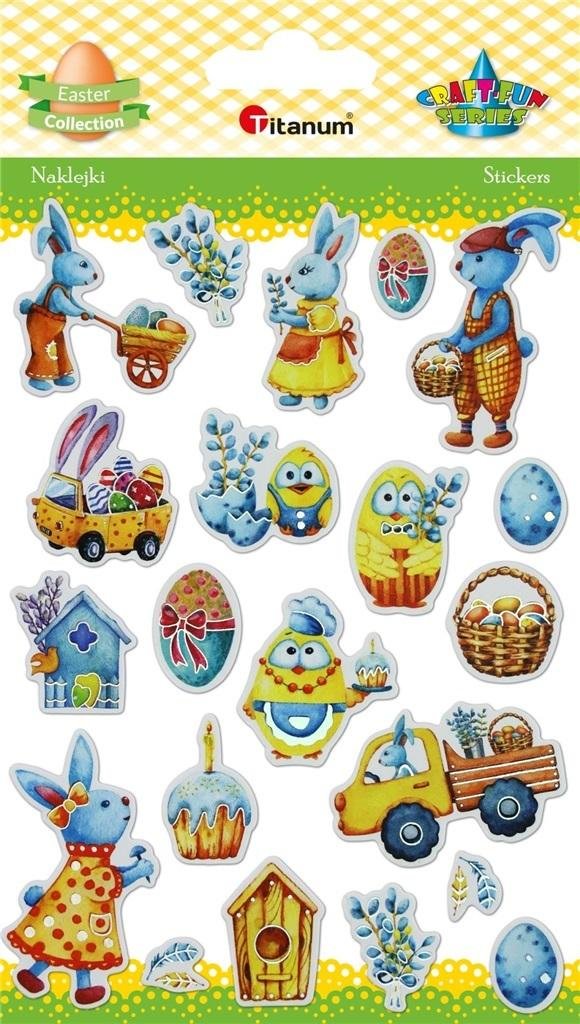 Naklejki wypukłe, wzory: zajączki niebieskie, kurczaczki, pisanki, koszyczek, samochody, domki dla ptaków. 21 sztuk. przeczytaj całość