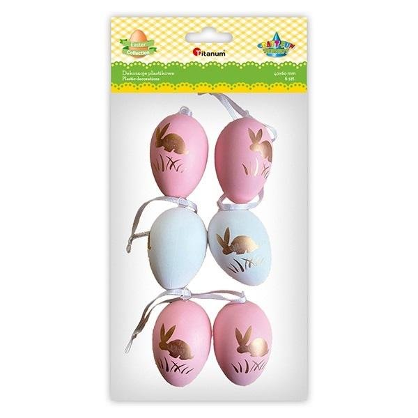 Zawieszki plastikowe jajka 40 x 60 mm białe, różowe ze złotym nadrukiem króliczka i trawy 6 szt. przeczytaj całość