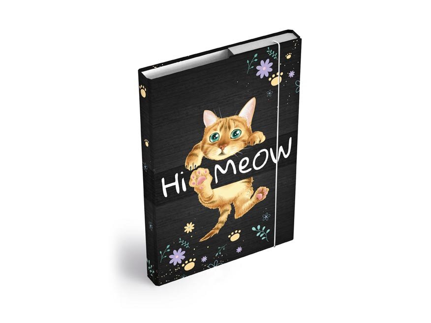 Szkolne okładki na zeszyty w rozmiarze A4 z motywem kotka. Niezbędny element wyposażenia każdego ucznia. Dzięki okładkom wszystkie zeszyty i podręczniki będą razem i nieuszkodzone. Te okładki na zeszyty są wyposażone w gumkę, która zapobiega samoczynnemu otwieraniu. Pudełko (heft box) jest wykonane z wysokiej jakości kartonowego papieru powlekanego laminatem. Z tego powodu można je bardzo łatwo utrzymać w czystości.