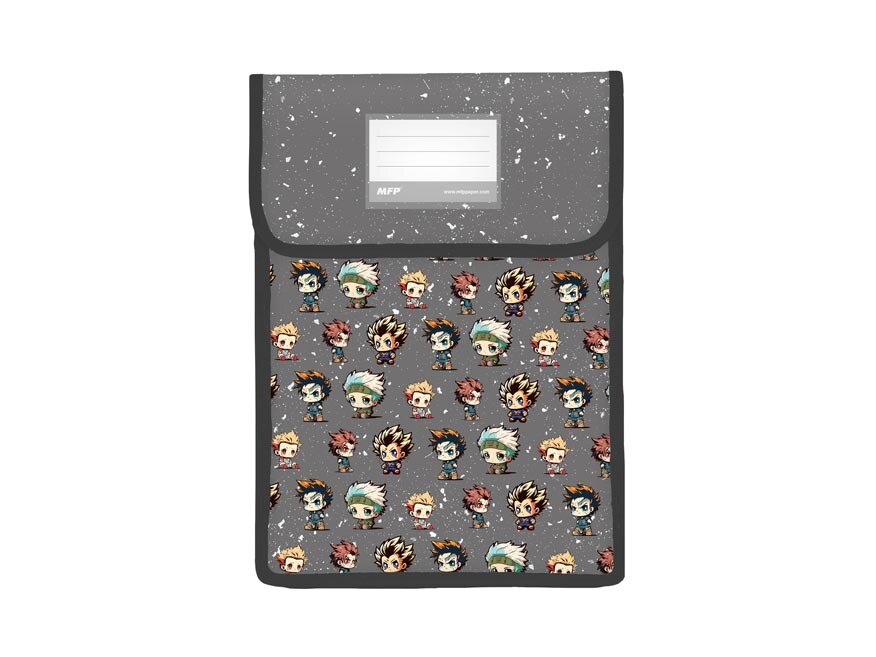 Wysokiej jakości teczka w formacie A4 w kolorze czarnym z motywem maskotek anime. Ochroni zeszyty, dokumenty i inne ważne arkusze. Na klapie teczki znajduje się etykieta do opisania. Teczka na rzep zapewnia, że zawartość nigdzie się nie rozsypie ani nie zniszczy. Krawędzie teczki są przeszywane.