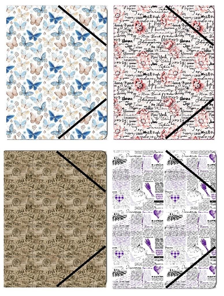 Ozdobna teczka na dokumenty formatu A4, zamykana na gumkę. Dostępna w czterech wzorach.Wzór wysyłany losowo. przeczytaj całość
