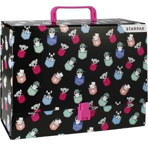 Zalety produktu: Teczka z rączką z kolekcji STARPAK z serii Minisy. Sztywna teczka wykonana z grubego, lakierowanego kartonu. Zamykana na plastikowy klips. Teczkę wyposażono w solidną rączkę. Teczka o szerokości grzbietu 9,5 cm. Idealnie sprawdzi się na zajęciach pozaszkolnych czy do...
