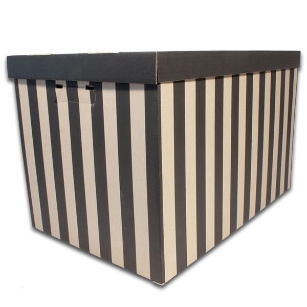 Te pojemniki wykonane są z wysokiej jakości trzywarstwowej tektury falistej, co zapewnia im wytrzymałość przy jednoczesnej lekkości. Brązowa tektura z czarnym nadrukiem wygląda estetycznie i pasuje do każdego wnętrza. Wycięte uchwyty po bokach ułatwiają przenoszenie, nawet gdy są pełne. Przy nośności do 15 kg i dnie składanym uzupełnionym przekładką otrzymujesz wytrzymały pojemnik, który utrzyma także cięższe przedmioty.