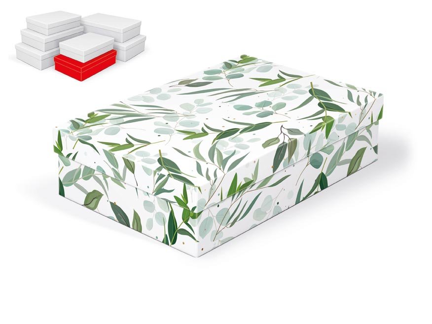 Celoroční dárková krabička o rozměru 28 x 18 x 7 cmDárková krabice s designem eukalyptových listů je vhodná ke slavnostním příležitostem, pro zabalení dárků na oslavy, svatby nebo jen tak, k uschování různých drobností. Je vyrobena z pevného papíru. Svým elegantním designem podtrhne Váš interiér....