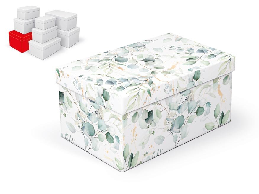 Dárková celoroční krabice o rozměrech 28 x 18 x 14 cmDárková krabice s designem eukalyptových listů. Vhodná ke slavnostním příležitostem, pro zabalení dárků na oslavy, svatby nebo jen tak, k uschování různých drobností. Dodáváme pouze v setu 8 dárkových krabiček, které jsou ve stejném designu,...