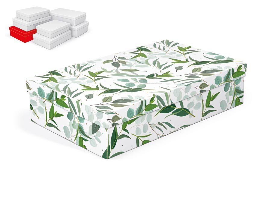 Celoroční dárková krabička o rozměru 234 x 22 x 8 cmDárková krabice s designem eukalyptových listů je vhodná ke slavnostním příležitostem, pro zabalení dárků na oslavy, svatby nebo jen tak, k uschování různých drobností. Je vyrobena z pevného papíru. Svým elegantním designem podtrhne Váš...