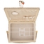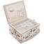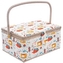 Wyściełane pudełko wyposażone jest w wyjmowaną wkładkę z przezroczystego, trwałego plastiku, podzieloną na cztery mniejsze i trzy większe przegródki, co umożliwia efektywną organizację przyborów krawieckich, koralików, igieł oraz innych drobnych przedmiotów. Na wewnętrznej stronie wieka znajduje się kieszonka oraz niezastąpiona poduszeczka na igły w kształcie tzw. biszkopta, gdzie możesz bezpiecznie przechować igły i szpilki. Praktyczne magnetyczne zapięcie utrzyma zawartość szczelnie zamkniętą, a składaną rączkę można wygodnie chwycić jedną ręką, co ułatwia przenoszenie.