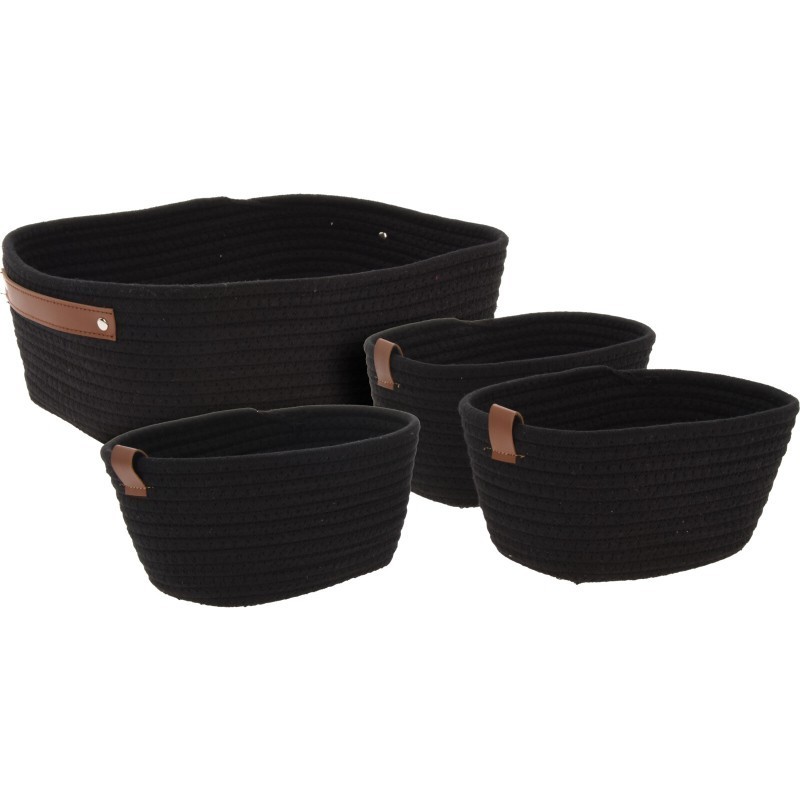 BASKET SET 4PCS, BLACK COLOR, POLYCOTTON ROPE, SIZES: SMALL: 220X160X110MM (3X) AND LARGE 350X250X130MM (1X). WEIGHT OF TOTAL SET 1000 GRAM. LARGE SIZE WITH PU HANDLE AND SMALL SIZES WITH PU LABEL. EACH PIECE WITH CRAFT H&S HANGTAG, ASS.:2 Sizes/ BASKET SMALL 3X(8720573 749855), 230X155X130MM, Hangtag (HT21)/ BASKET LARGE 1X(8720573 749862), 340X275X135MM, Hangtag (HT21) / CFT 1,91,(4.704/40ft HQ)