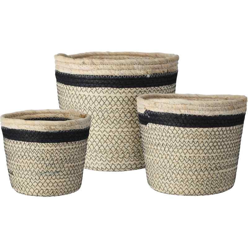 BASKET,CORN LEAF, NATURAL WITH BLACK STRIPE SET OF 3, SIZES: SMALL: 17X15CM, MEDIUM: 20X18CM, LARGE: 23X21CM, EACH PIECE WITH HANGTAG AND UNIQUE BARCODE/ BASKET SMALL(8720573 482202), HEIGHT150XDIA170MM, Hangtag (HT21)/ BASKET MEDIUM(8720573 482219), 230X230X190MM, Hangtag (HT21)/ BASKET...