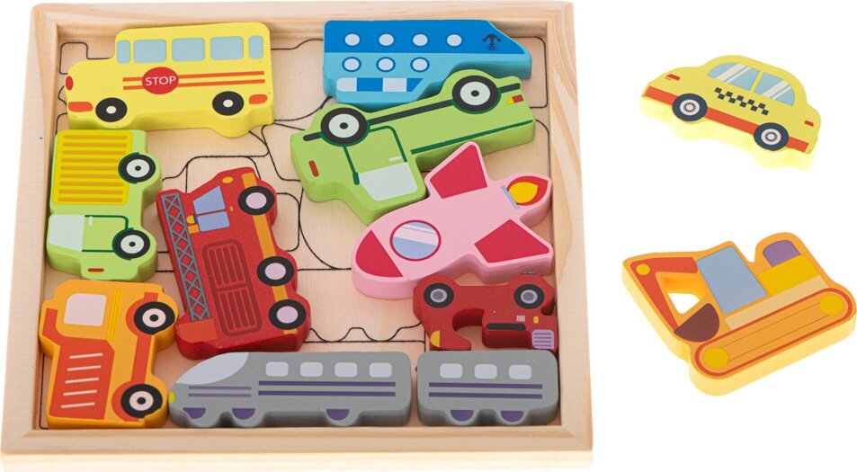 Dřevěná hlavolamová skládačka s dílky ve tvaru dopravních prostředků. Pojmenovávejte jednotlivá vozidla a ukládejte je podle obrysů, dokud nebudou všechna schovaná v krabičce. 12 dílků s dopravními prostředky na dně krabičky jsou zakresleny obrysy dílků pro těžší obtížnost můžete obrysy...