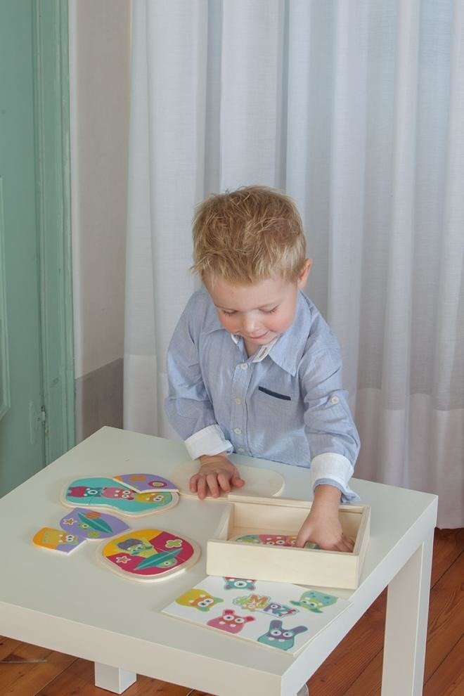 Każdy z 4 obrazków do ułożenia posiada elementy świecące w ciemności, łącznie zestaw składa się z 16 drewnianych części. Całość mieści się w poręcznym drewnianym pudełku. Wymiary: 20 x 5 x 16 cmSeria MRZ Sevi posiada elementy, które świecą w ciemności! przeczytaj całość