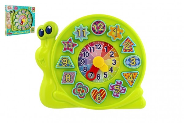 Děti se mohou naučit hodiny zábavnou formou. Hodiny s motivem šneka mají pohyblivý ciferník, kolem kterého jsou také vkládací čísla. S touto vkládačkou děti procvičí jemnou motoriku, díky vkládacím tvarům s čísly. Dítě se zábavnou formou seznamuje s poznáváním hodin, pomocí mechanického otáčení velké a malé ručičky.