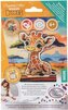 Opakowanie zawiera: drewnianą deskę w kształcie postaci z nadrukowanym obrazkiem, drewniany stojak, piórko do aplikacji kamyczków, miskę, wosk do przyklejania oraz zestaw kolorowych kamyczków.