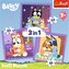 Poznaj Bluey to 3 niezależne układanki dla dzieci, zaprojektowane z myślą o małych fanach bajki Bluey. Po ułożeniu puzzli powstaną trzy obrazki, z czego największy o wymiarach 200x195 mm. Zróżnicowana liczba elementów pozwala na zabawę zarówno młodszym, jak i nieco starszym dzieciom.