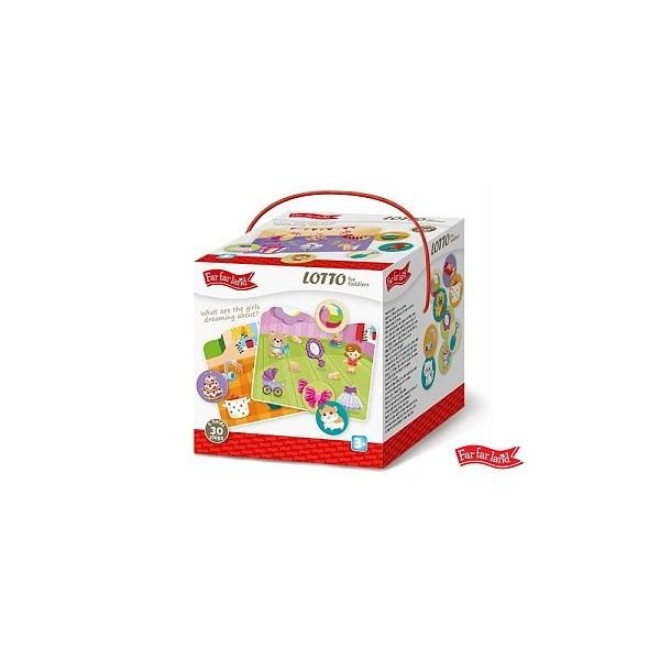 Far Far Land Lotto karty przygód. Zestaw zawiera 30 żetonów i 5 plansz do gry z motywami dla dziewczynek. Gra jest wykonana z mocnego kartonu o grubości ponad 2 mm, którego powierzchnia jest pokryta ilustracjami drukowanymi bezpośrednio. Materiał sprawia, że plansza i żetony się nie odkształcają ani nie łamią, a technika nadruku obrazków dłużej zachowuje ich jasność i żywość. Wszystkie elementy bingo mają zaokrąglone rogi, aby zapobiec skaleczeniom podczas gry. Gra jest doskonałym ćwiczeniem uwagi, pamięci i małej motoryki. Do dyspozycji jest także pudełko do przechowywania z wygodnym uchwytem, dzięki któremu można zabrać ją na spacer lub wycieczkę. Zalecany wiek: od 3 lat
