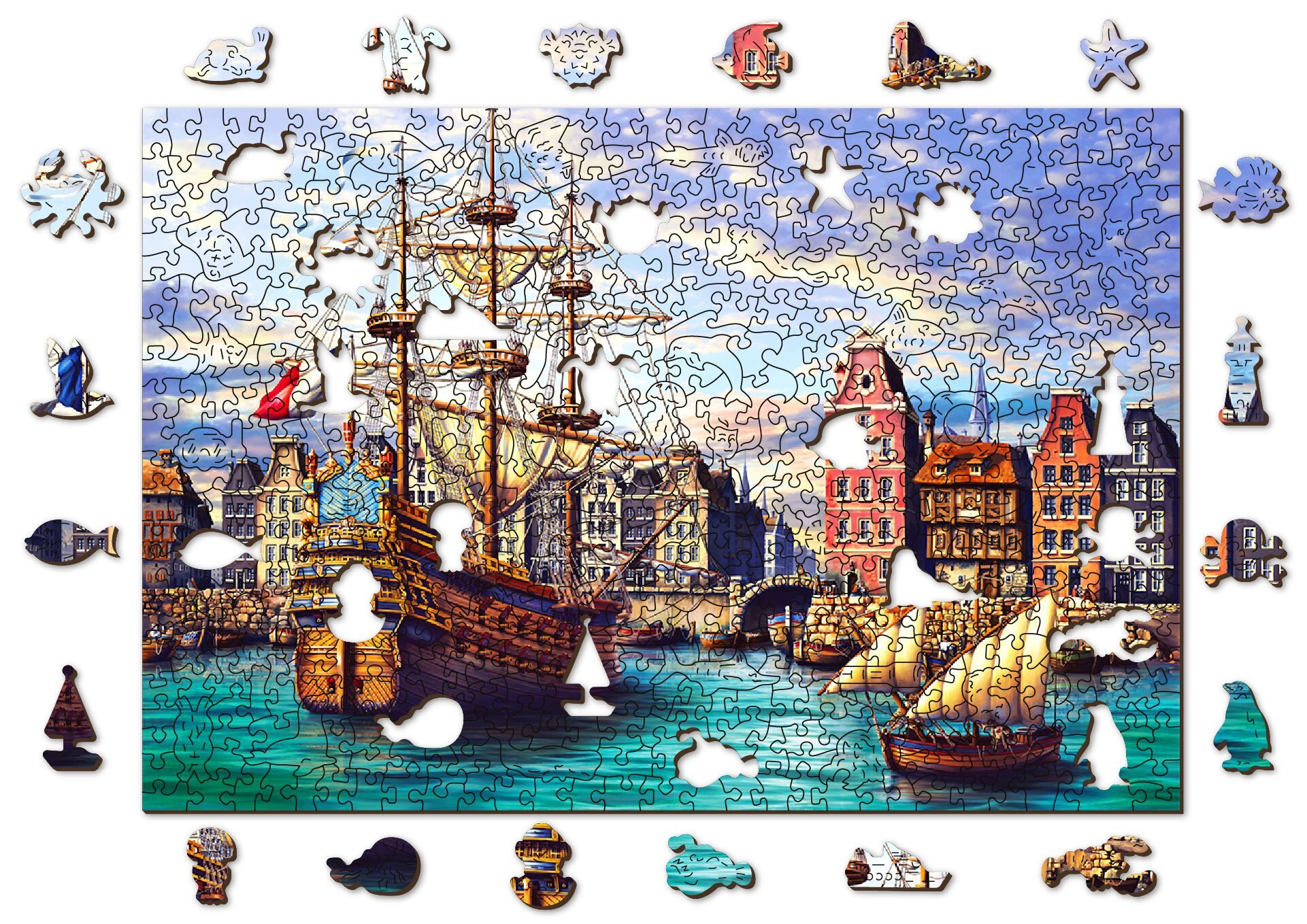 WOODEN CITY Dřevěné puzzle Staré lodě v přístavu 2v1, 505 dílků EKO