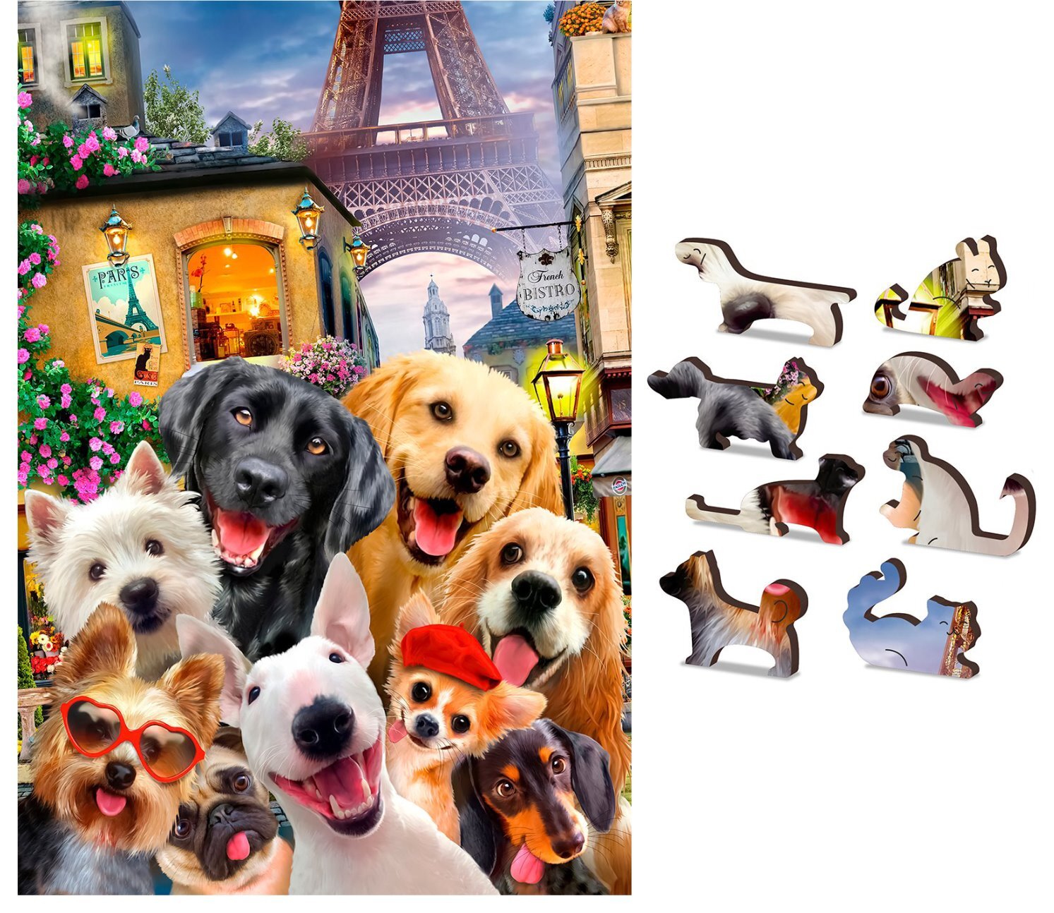 WOODEN CITY Dřevěné puzzle Štěňata v Paříži 2v1, 75 dílků EKO