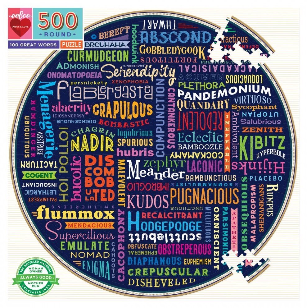 Tak tohle bude pořádná výzva! Na tmavě modrém podkladu najdete 100 slov. Různé barvy, různé fonty a slova, která můžete znát a pokud ne, tak si alespoň zlepšíte angličtinu a rozšíříte slovní zásobu. Po složení netypického tvaru pro puzzle si můžete hotový obraz pověsit na zeď, bude to krásná dekorace v každém pokoji. Puzzle od amerického výrobce EEBOO.