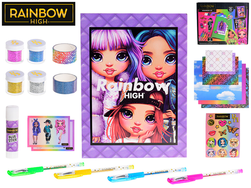 Rainbow High to szkoła średnia, w której wszyscy uczniowie ubierają się jak ikony mody, a ich styl przyprawia o zawrót głowy! Przemień swoje włosy w dzieło sztuki i twórz fryzury pełne brokatu i kolorów! Ten zestaw Rainbow High dla młodych panienek zawiera 3 flamastry do włosów, szablon, brokat, żel i kryształki do włosów. Odpowiedni dla dzieci od 3 lat.