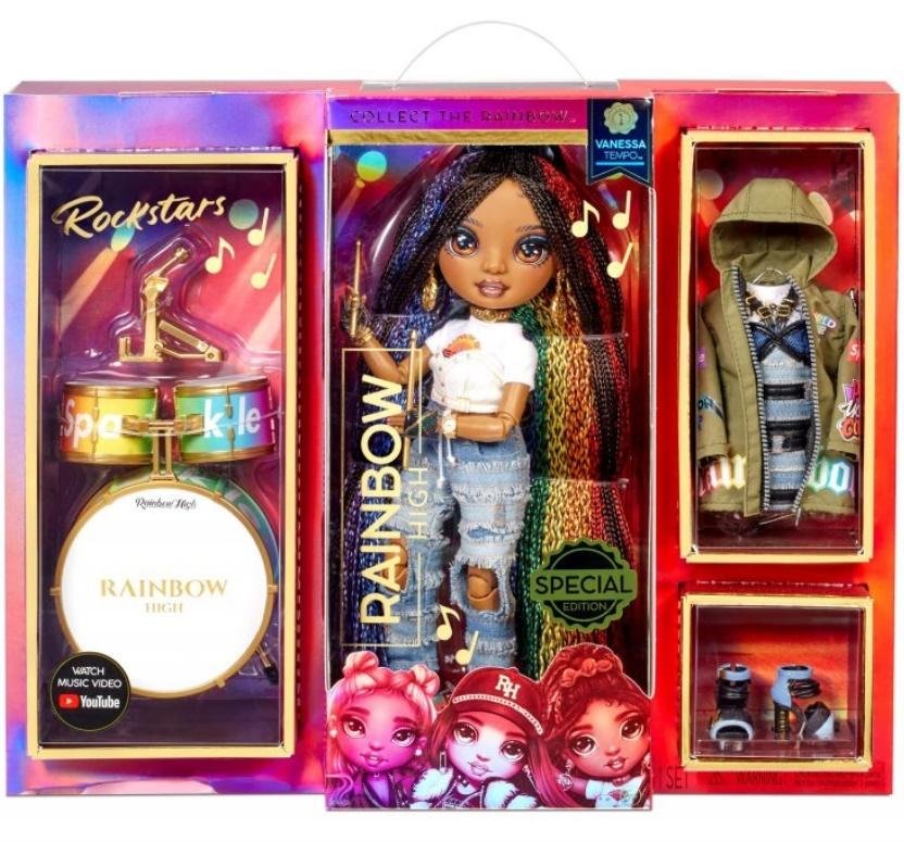 Lalka Rainbow High Rockstar Vanessa Nova wraz z wieloma akcesoriami takimi jak stroje, biżuteria, frotka do włosów, grzebień instumenty muzyczne oraz inne. przeczytaj całość