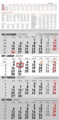 Der '4-Monatskalender' im Format 30 x 60 cm, mit internationalem Kalendarium, neutralem Design (grau und weiß), rot gehaltenen Sonn- und Feiertagen, Wochenzählung und rotem Datumsschieber bietet eine ideale Übersicht über den Vormonat, den aktuellen Monat und die zwei kommenden Monate. Die Lochung im Fälzel dient der Wandaufhängung: Ein Einblockkalender insbesondere für das Büro oder das Home-Office.