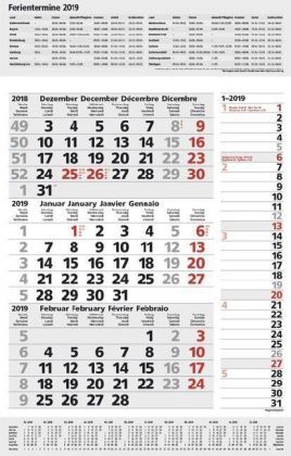 Kalendarium auf D/E/F/I mit farblich hervorgehobenen Feiertagen für Deutschland, Österreich und Schweiz.