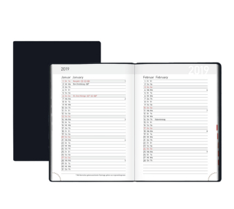 Kompakter Taschenkalender mit schwarzem Einband aus PVC. 168 Seiten, 2 Seiten pro Woche. Kalendarium d-e-f-i. przeczytaj całość