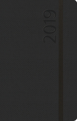 Moderner Buchkalender mit schwarzem Einband. Umschlag aus edlem Strukturpapier. Pro Woche 1 Doppelseite. Mit deutschem Kalendarium und Jahresplaner für 2019 und 2020. przeczytaj całość
