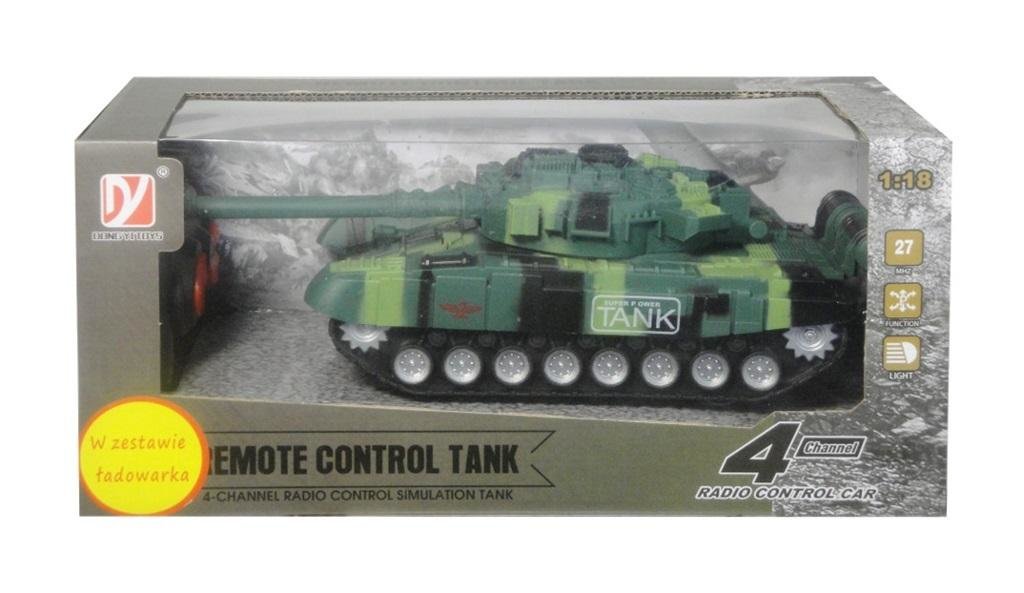 Plastikowy czołg dla dzieci sterowany pilotem. Świeci światełkiem, obraca działem i porusza się we wszystkich kierunkach (prawo, lewo, przód, tył). Produkt działa na baterie typu AA (niezałączone) oraz Ni-Cd (załączone) Produkt dla dzieci od 3 lat. Produkt zapakowany w kartonowe opakowanie z przezroczystym okienkiem Podane wymiary stanowią wymiar opakowania.
