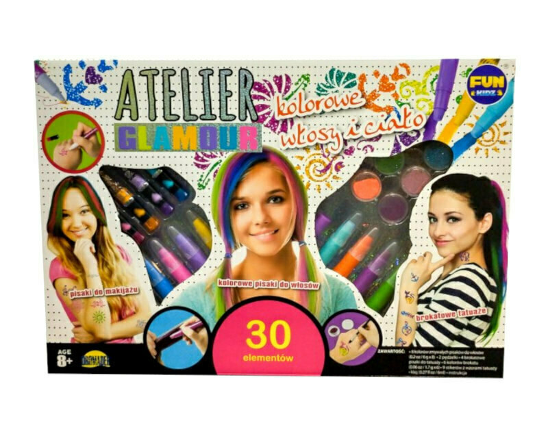 Zestaw (30el) do samodzielnej stylizacji (koloryzacji) włosów i ciała. W zestawie: 8 kolorowych zmywalnych pisaków do włosów, 2 pędzelki, 4 brokatowe pisaki do tatuaży, 6 kolorowych brokatów, 9 naklejek z wzorami tatuaży, klej, instrukcja.Wymiary opakowania: 45x31x7cm.Wiek: 8+. przeczytaj całość