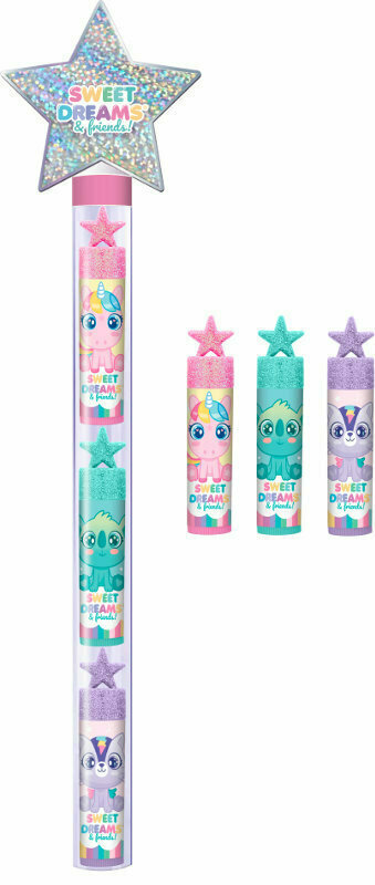 Abrakadabra! Dzięki nowej magicznej różdżce Sweet Dreams Lip Balm Twoje usta będą zawsze miękkie i magicznie nawilżone. Ten czarujący zestaw zawiera trzy balsamy do ust w pysznych smakach limonki, truskawki i jagody, każdy inspirowany uroczymi postaciami Sweet Dreams.Prezentacja w kształcie...