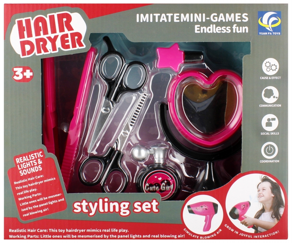Zalety produktu: rozwija kreatywność dziecka, pozwoli dziecku wczuć się w rolę prawdziwego fryzjera. Zestaw fryzjerski do tworzenia stylizacji fryzjerskich . Zawartość zestawu: prostownica do włosów, 2x nożyczki, lusterko, 1x lakier do paznokci, 1x buteleczka z rozpylaczem na lakier do włosów....