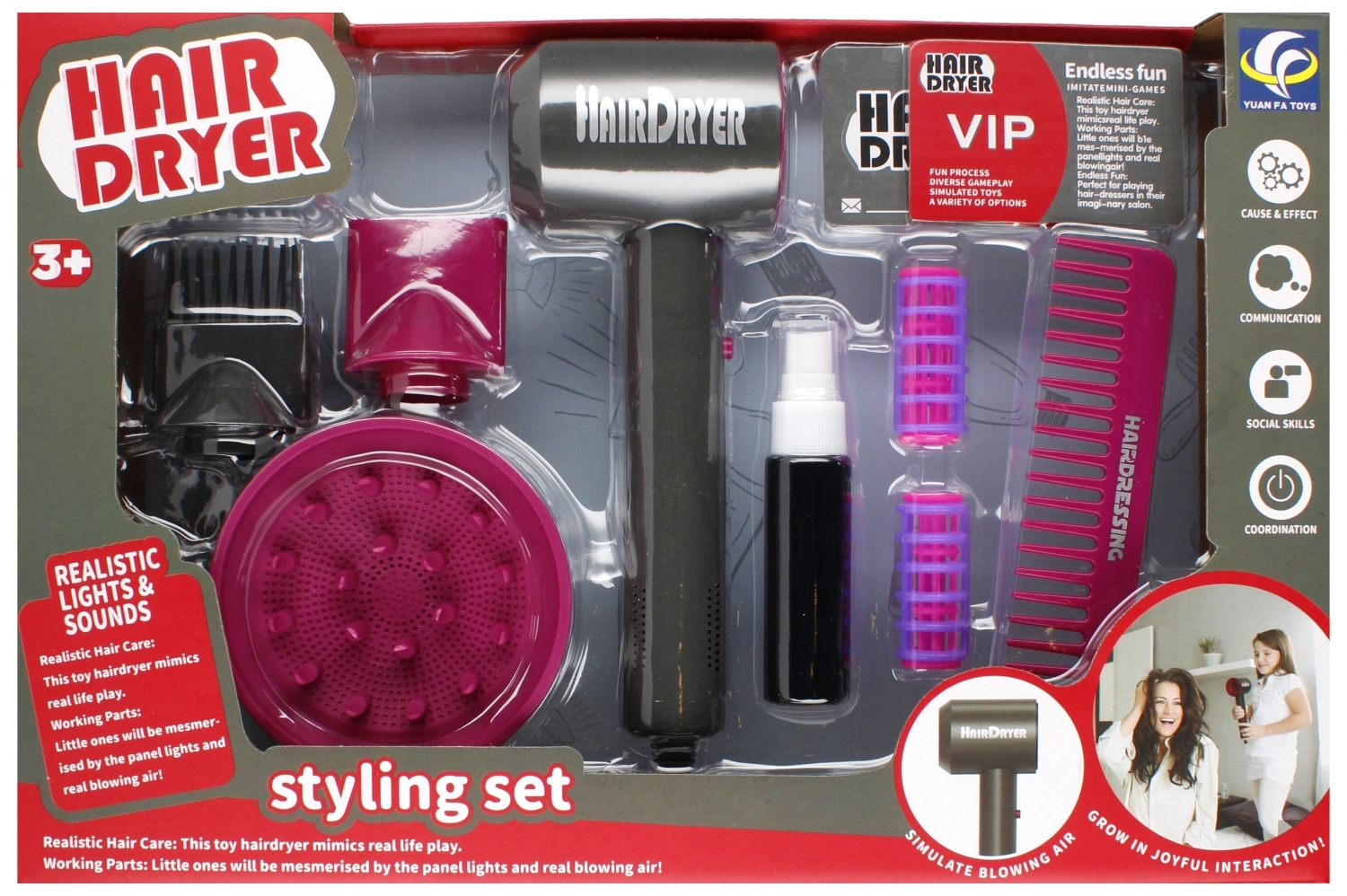 Zalety produktu: rozwija kreatywność dziecka, pozwoli dziecku wczuć się w rolę prawdziwego fryzjera. Zestaw fryzjerski do tworzenia stylizacji fryzjerskich . Zawartość zestawu: suszarka do włosów 3 nakładki, grzebień, 2x wałek do włosów, buteleczka-spray do włosów, 2x karta VIP. Zestaw wykonany...