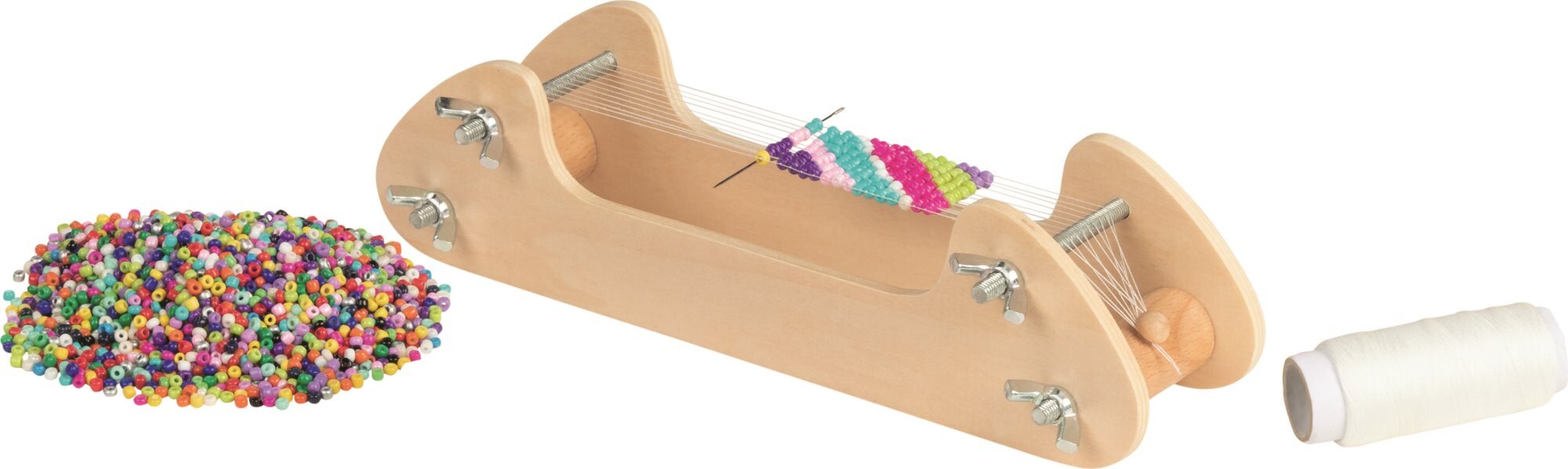 - Zawartość opakowania: rama tkacka, kolorowe koraliki, szpulka białej nici, instrukcja