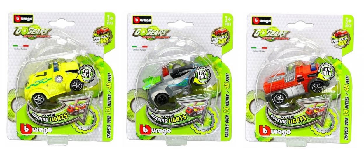 Samochód Bburago w skali 1:55, napędzany systemem Pull Back And Go. Samochodzik przejeżdża do 14 metrów i osiąga prędkość w skali ponad 322 km/h. Samochód pasuje do zestawów z serii GoGears. Trzy wzory - straż, karetka i policja.Towar wysyłamy losowo przeczytaj całość