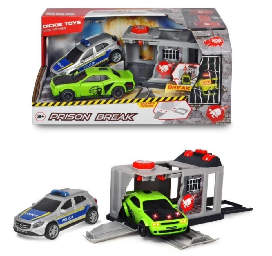 Zestaw Więzienie posiada klatkę z możliwością blokady, więzień może uciec z klatki tylnymi drzwiami, w zestawie: samochód bandyty z funkcją crash oraz światło i dźwięk, pojazd policyjny marki Mercedes, bez napędu, Tre Me, WERSJA POLSKA, baterie 3 x 1,5 V LR44 w zestawie. przeczytaj całość